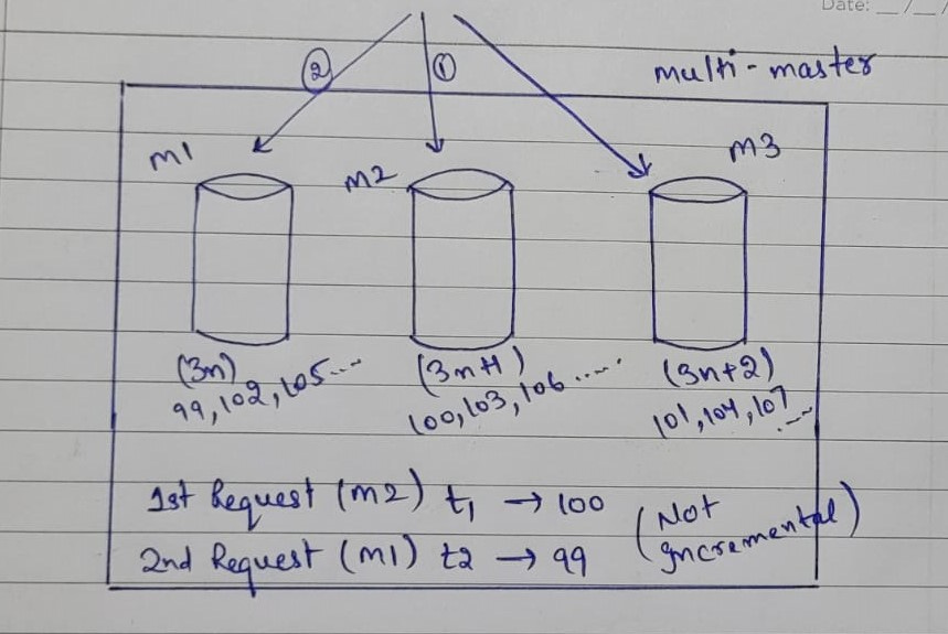 Let us assume there are three different machines in a distributed computing environment. Let us number the machines as M1, M2, and M3. Now suppose the machine M1 is set to assign the IDs, which are a multiple of 3n, machine M2 is set to assign IDs that are a multiple of 3n+1, and machine M3 is set to assign IDs that are a multiple of 3n+2.